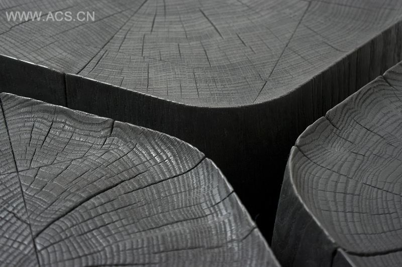 所有桌子均为手工雕刻而成,其表面采用喷枪进行焦化处理。木材由变为木炭,具有了矿物质的特点,展示了木材的天然特性。五个桌面看起来如同从远古时代走来的化石。