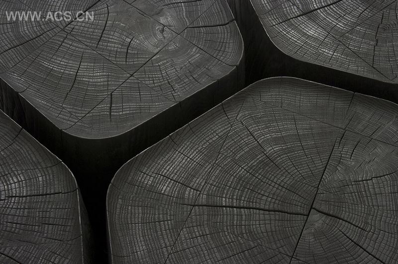 "玄武岩"(Basalt)系列共有5个经焦化处理的木质咖啡桌,采用同一根橡树树干制成。设计师将树干进行切割和重组,只保留心材。心材是树木品质最高的部位,被誉为“完美木材”。
