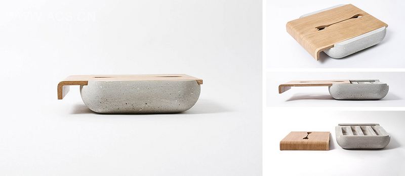 "Dobrobox"餐具盒由纤维混凝土制成。木质的盒盖可以通过拉动曲线边缘水平移动。盒子内部有四个凹槽,分别用来放置勺、叉、刀和小勺四种餐具。盒盖上刻有勺和叉的凹槽图样。