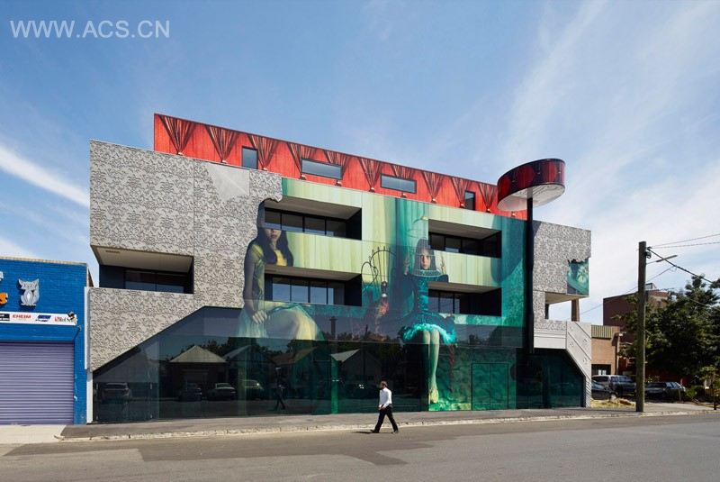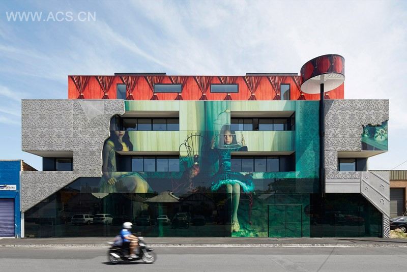 Australian artist Samantha Everton, worked with the architecture practice Kavellaris Urban Design, to create the fa?ade of this new building in Melbourne, Australia. The mixed-use building is called “2 Girls,” and features Everton’s “Masquerade” photo art from her “Vintage Dolls” series, re-created as the building’s fa?ade.