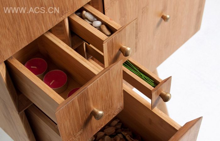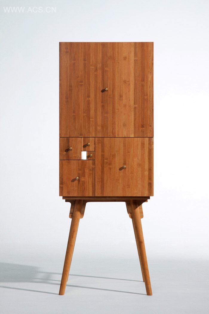 采用环保的竹材制作,柜子总共由7个独立部分组成: 最上方的大柜子, 5个不同规格的抽屉,以及最下方的桌子(其结构取自于明式的矮几)。所有部件由底部的卡孔咬合,除整体使用外,亦可根据空间或实际需求,进行组合或拆分。