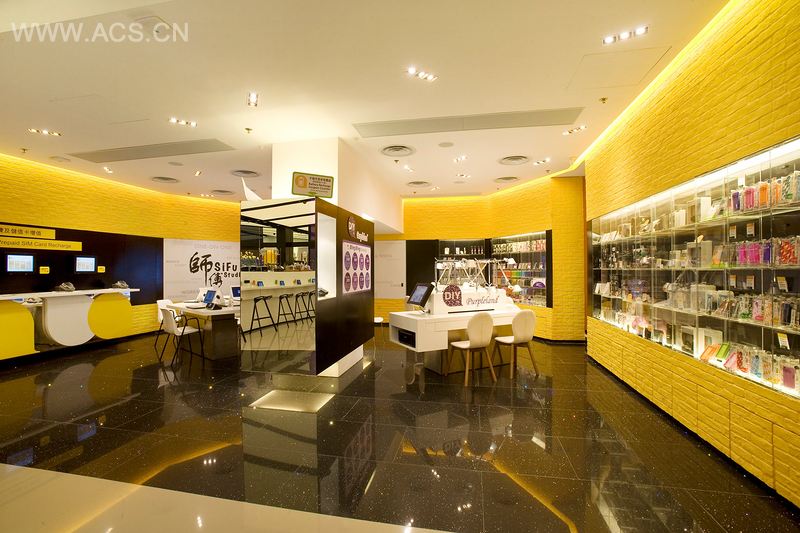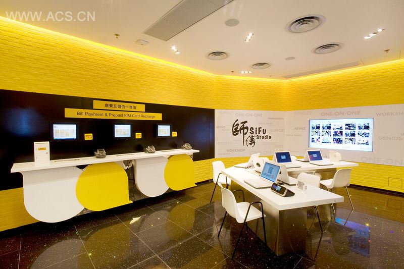 An extension of the DIY Zone, the two zones are connected by a symmetrical yellow brick wall. The SiFu Studio also features an L-shaped table, and this area offers customers the opportunity to discover the latest mobile device features.
