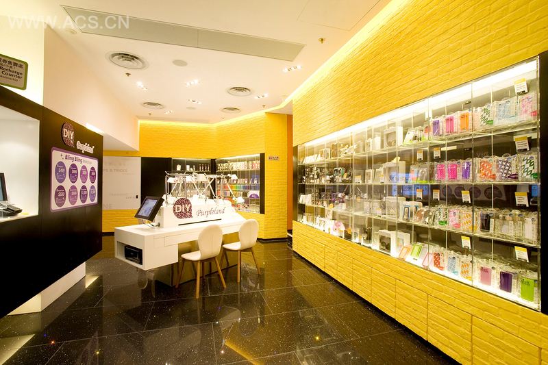 Inspired by the concept of a vintage workshop, mechanical lamp embellishments on an L-shaped worktop add to an inspiring creative zone where customers can personalize their mobile phones.