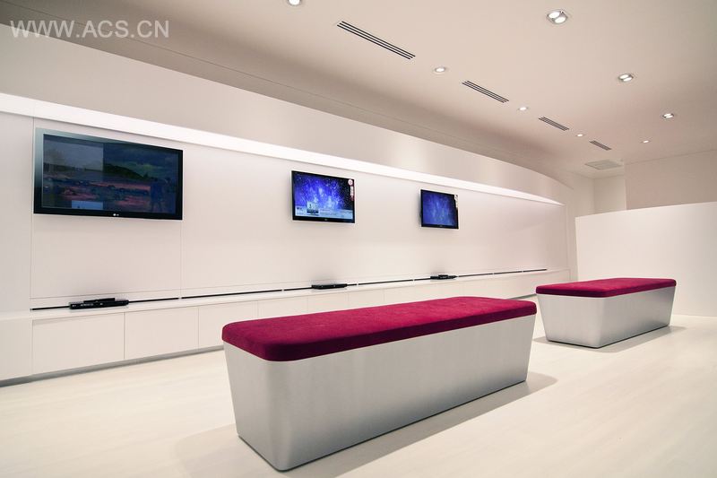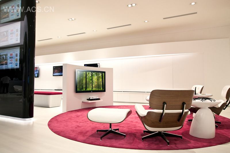 The store features pure white surfaces throughout, combined with natural wood create a harmonious feel. The LG corporate color, magenta, is used as a highlight in premium fabrics and carpets.
