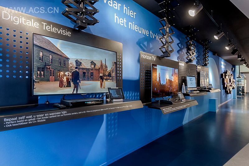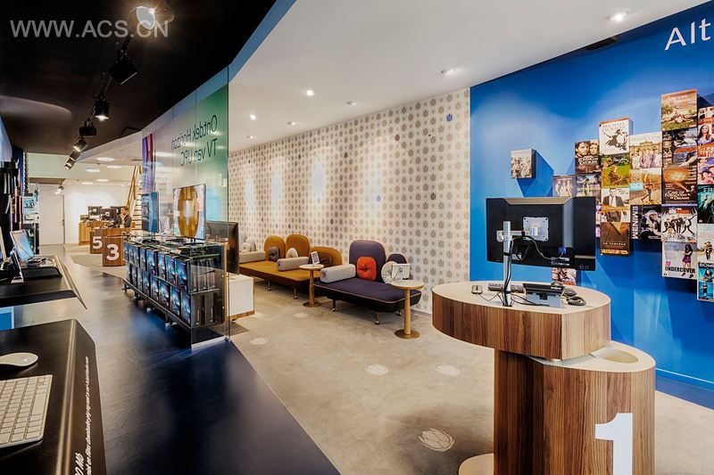 Storeage's design for the new UPC store in Dordrecht breaks the myth of the 'all-boys-football-night' and caters to the needs of women. The store is divided in two areas: a masculine themed service area 'Behind the Screens' which echoes of a well-oiled machine ensuring premium service. The other side of the store, 'In front of the Screens', features a feminine area, where the customer can watch television in comfort.