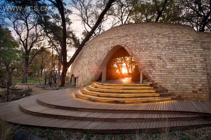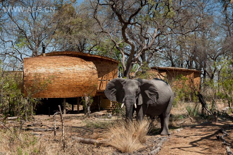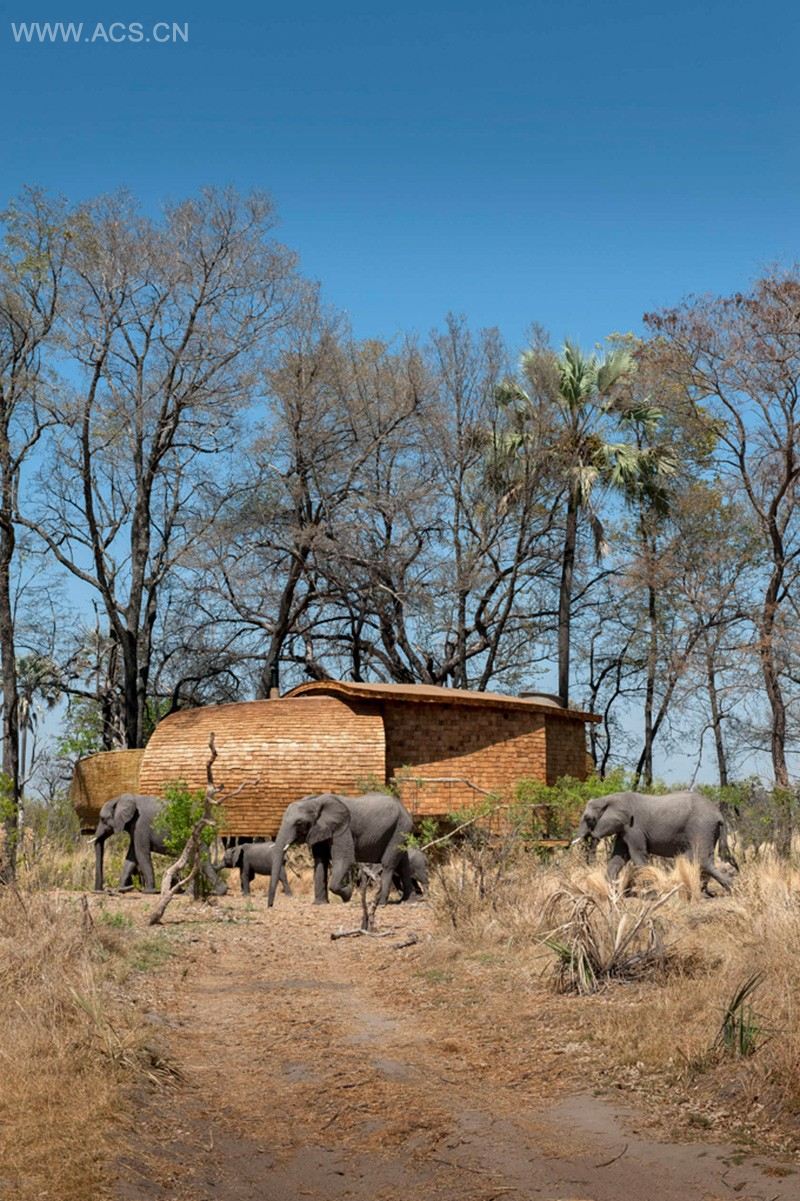 The lodge is sensitively designed to blend in with the surrounding landscape in Okavango Delta adjacent to a lively games reserve. Clad in natural shingles and woven saplings, the entirely timber structure is bold and dramatic unlike anything that has been seen before in the Delta region.