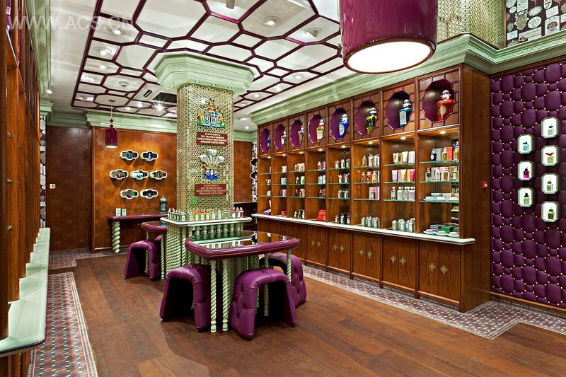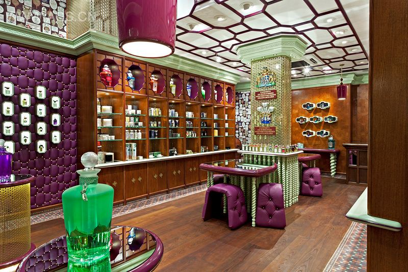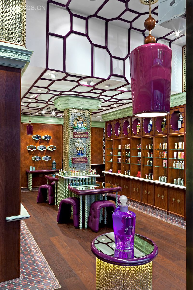 Giant padded walls, punctured by sticky chamfered light boxes, draw the eye into a kaleidoscope of heritage; ceiling roses inspired by Westminster Abbey introduce a Tudor fretwork ceiling from which glossy Brighton Pavilion Onion Dome chandeliers are suspended.