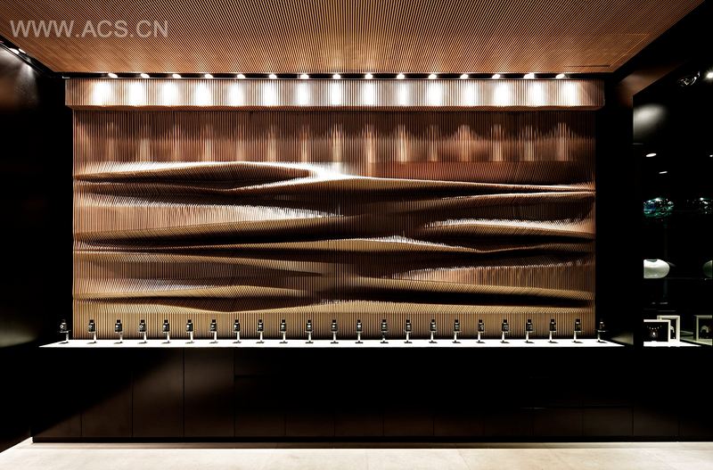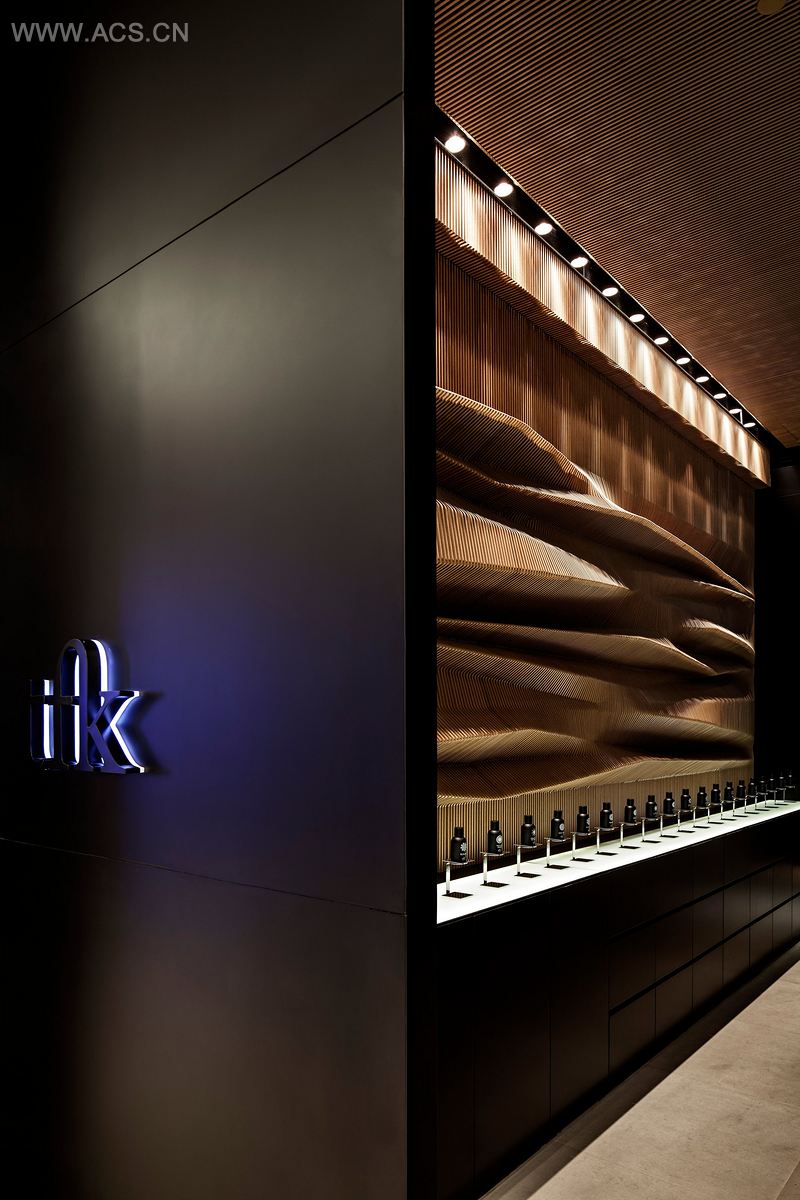 As the consumer walks in they are struck with the seductive, sensual, and directed ambience of the shop. They are initially drawn to the spectacular wooden wall display consisting of 500 laser cut wooden pieces designed to emulate the smoke of Arabian incense; recognized as bukhoor in the Arabic language. This wall display highlights a specific line of the products resting on a backlit surface carefully aligned under a parallel direct light.