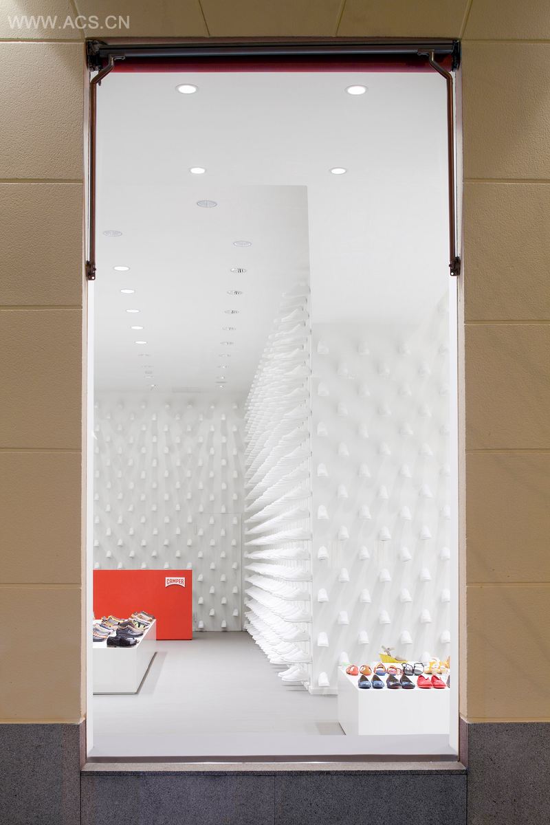 A new concept for Camper’s larger shops, following on our concept of ‘shoes that walk freely through the air’ developed for Camper’s small-scale shops in cities like Osaka, Paris, San Francisco and Moscow. The design concept for the large shops had faced a consistent challenge: in a high-ceilinged space, to use the upper part of a space with high ceilings. Our new approach was to make white resin models of the Pelotas shoe, a Camper stalwart, then to fully decorate walls with them, adding volume to the space as well as the orderly atmosphere of a storeroom. The shoes catch light pouring through the windows to cast shadows on the walls, giving the space a three-dimensional texture. We’ve created a shop interior with two types of shoes: products and interior materials.