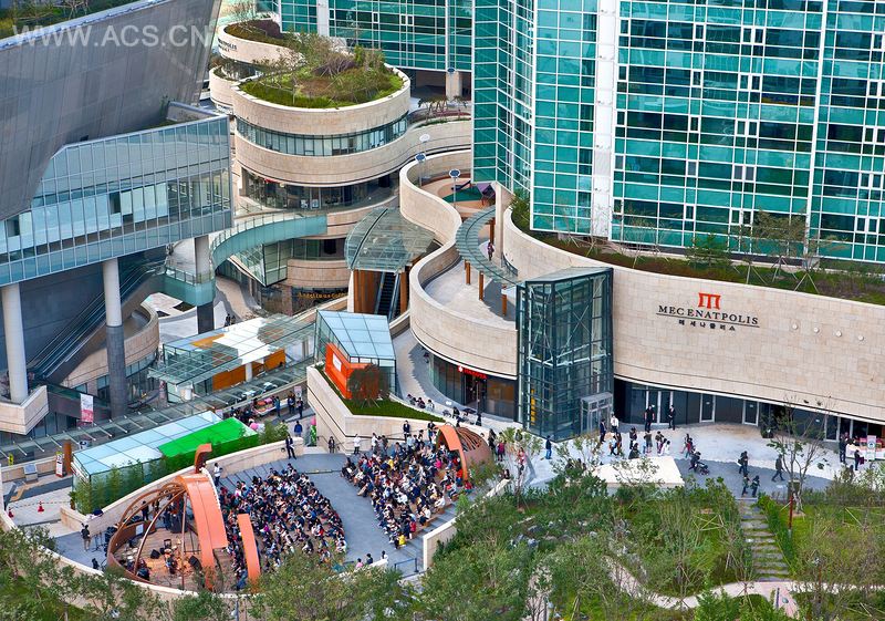 露天区域包括90000平方米的零售和餐饮服务区,以及提供给游客和当地居民举办文化娱乐活动的礼堂和公共公园。露台、玻璃桥、绿化的屋顶花园、露天的空间、迷人的水景和中央的大广场都强化了一个创意:在零售综合区的核心位置精心设计一个流水式循环系统。自由流动的韵味结合该地区“合则利”的古老概念塑造出一个主要的中心广场,这个广场是Mecenatpolis的核心聚集区,其中包括了活跃的水景与丰富的露天公共空间和餐厅就餐区等,能够吸引人们加入其中。多功能礼堂毗邻文化公园,被设计为一个醒目的带有美丽木镶板的花灯状建筑,它可以用来举办如音乐会或其他特殊表演的活动。