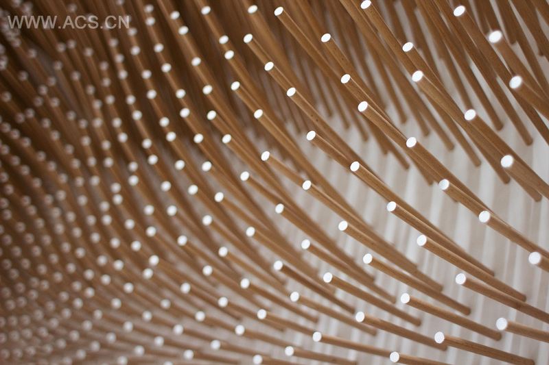 The wall was designed using customized digital tools to master the large number of wooden sticks. CNC-drilled holes define the individual direction of every stick installed. Only a perfectly streamlined production process guaranteed the efficient and feasible realization of the project.
