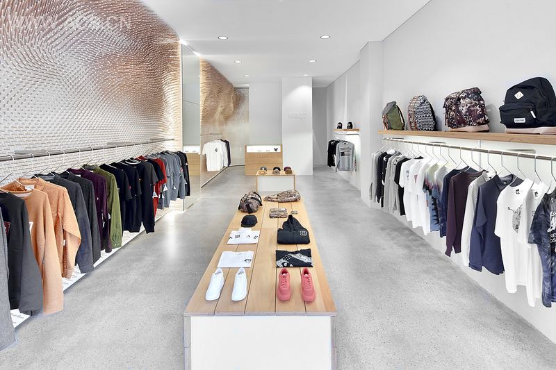 Swiss architecture firm ROK - Rippmann Oesterle Knauss has completed the MRQT boutique in Stuttgart, Germany. The store features a unique fur-like wall consisting of 22.000 wooden sticks with individual directions and of various lengths. The installation refers to the flowing forms and delicate texture of textiles and cloth. It creates a unique and sensational background for the fashion items displayed on the smoothly integrated clothes hangers. The flow of wooden sticks and subtle lighting s a central full height mirror and forms a central “stage” for the customer. Display stands and shelving in beech wood match the material of the wall installation. Together with the minimalistic interior space featuring white walls and a grinded concrete floor, the store develops a warm and inviting atmosphere for the customers browsing through a well-curated selection of premium street-wear brands.