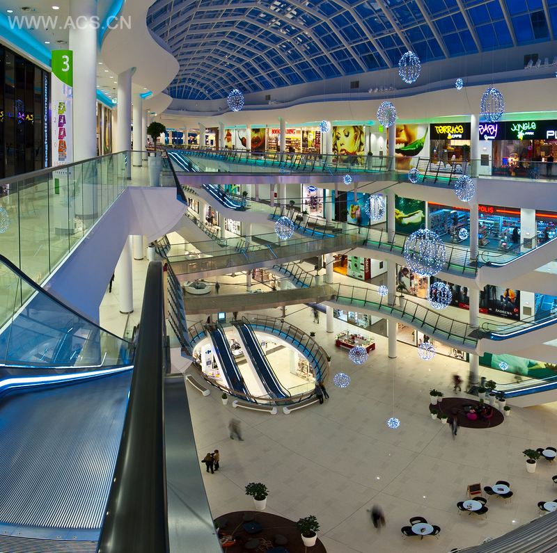 保加利亚商城的建筑理念特殊之处在于其零售区域是大型中央空间分布的。日光从2500平方米的大玻璃屋顶上流下来。与外部直立结构相反,柔和的椭圆形和流体形统治了内部空间。扭转的通道曲线、栏杆的斜面、空中交错的桥梁和穿越的扶梯都创造了独特的具有表现力的动态环境。舱壁优雅的饰面、横向栏杆和湾灯强调了凸起和凹陷的空间连续脉动。