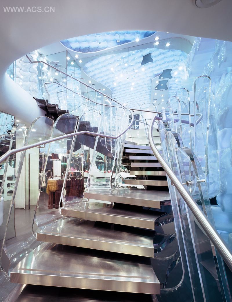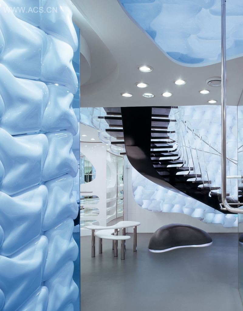 Once inside the strange organism, visitors forget they are in a regular building with traditional walls and ceilings and more stories above them. Central to the ideas of fluidity, transparency, and openness that enhance the store’s overall feeling of spaciousness as well as product visibility, is the clever use of materials, shapes, and light. Walls and ceilings are covered by a luminous membrane composed of more than 1,000 asymmetric molded elements, backlit by over 1,300 feet of natural spectrum LEDs. As visitors move through the two different levels of the store, a single polycarbonate, convex element becomes the starting point of a pattern that moves across the ceiling, propagates to the wall, and from the wall, pushes forward into organic individual supports for the merchandise. Sometimes clusters of these elements separate from the wall and ceiling surfaces to become seats or pedestals. Along the walls, even to the exterior surface of the dressing rooms and across the ceiling, what looks like a gliding, apparently weightless membranous liquid surrounds the visitor. Infused with light, this fluid, surrogate sky becomes a vertigo-inducing game of refractions that confuses the senses; as soon as the mind accepts one point of view, the eyes are surprised by yet another perspective.
