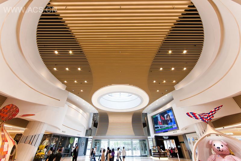 商场中心处的戏剧中心区域是室内活动空间与室外市民广场的过渡空间。设计中的环抱曲线为表演及活动加强了舞台效果。灯光展示设计成仿佛公园的星星,突出一种感觉:游客集聚在中心点欣赏城市生活。