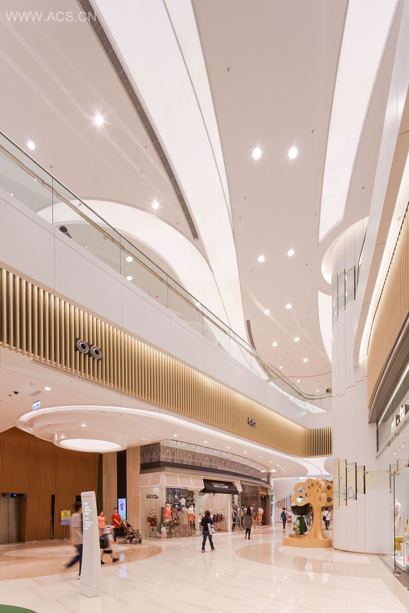 250米的长形零售中心空间是一系列的创新街景,营造了具有视觉和互动体验的艺术‧公园的气氛。它将成排的商店变成了富有视角变化和几何韵律的探索型路径。中庭和活动空间是节点,它们像涟漪一样产生了具有穿透力的波浪。