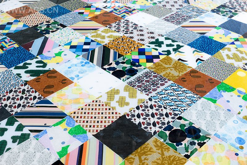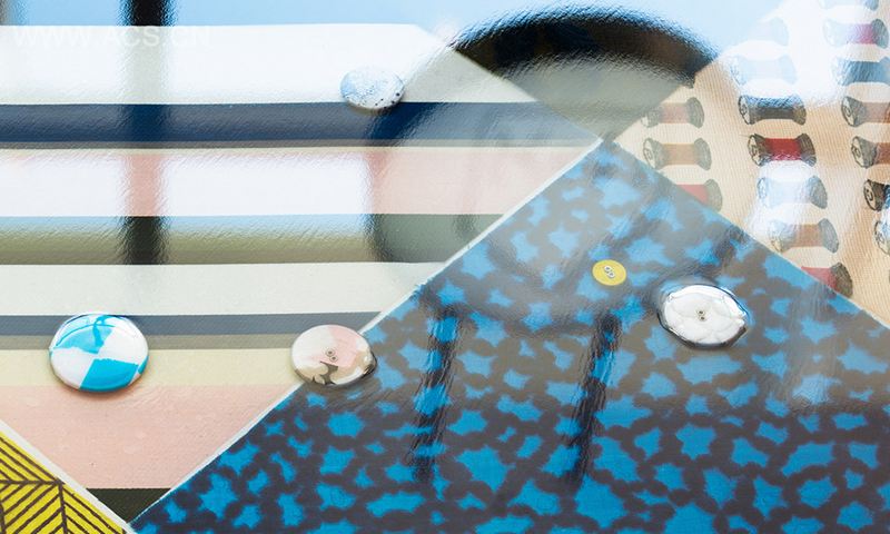这座小小店铺里面有一池令人惊艳的环氧树脂浇注的地板,色彩鲜艳斑斓的织物与纽扣被树脂覆盖,仿佛打了一层高光,或者说像被侵泡在水里,色彩更加艳丽,宛如一汪彩池。
