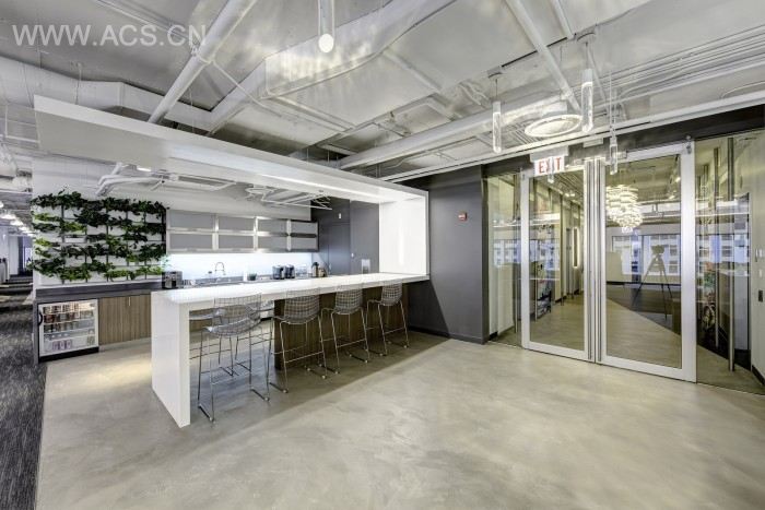 灰白打造而成的时尚办公空间,独特的天花板设计既引入自然光线,又成为独特的视觉元素之一。