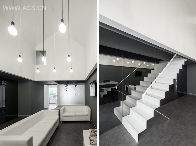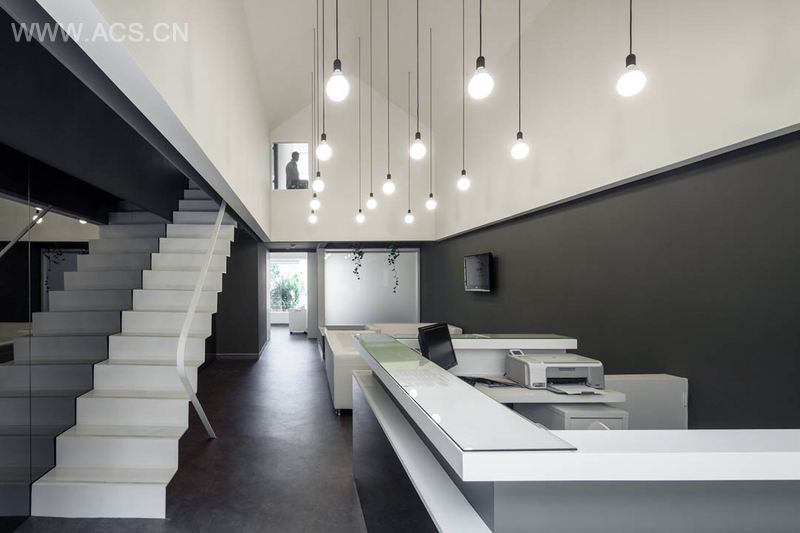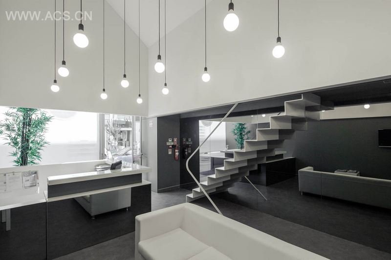 这个诊所用地下载而狭长,因此建筑师在大厅空间保持较高层高和使用镜面进行反射。轻薄的楼梯通向上层休息室,休息室朝大厅开了一扇窗,增加了空间层次。大厅天花上呈坡屋顶造型,垂下的灯泡给空间宛如天光的照明。大厅的尽头是治疗室。这个设计保持医疗的正式感,并避免其的紧张感,是一个让客户感到愉悦的空间设计。