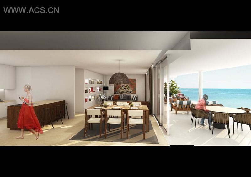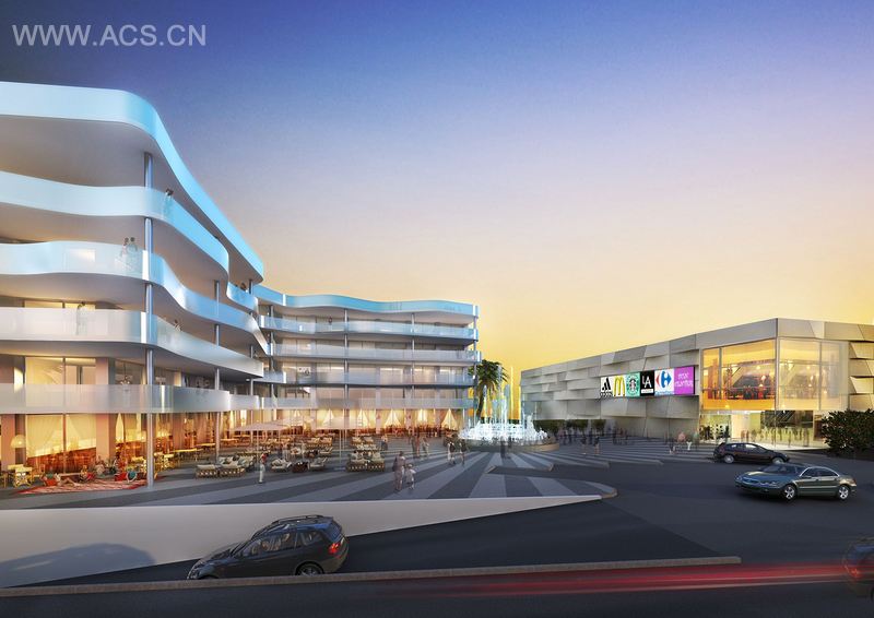 由于策略上的一个改变,项目不得不适应正在实施的底层+3层钢结构建筑许可。因此,零售布局不得不成为一个直线型购物中心,一个大型超市、电影院和第4层的一个娱乐中心固定在底层的中央大厅上,中间是空心的。此外,还有一个L型酒店式公寓建筑,它与高档餐厅一起形成一个正方形,并按照当地传统设有一个水烟露台。