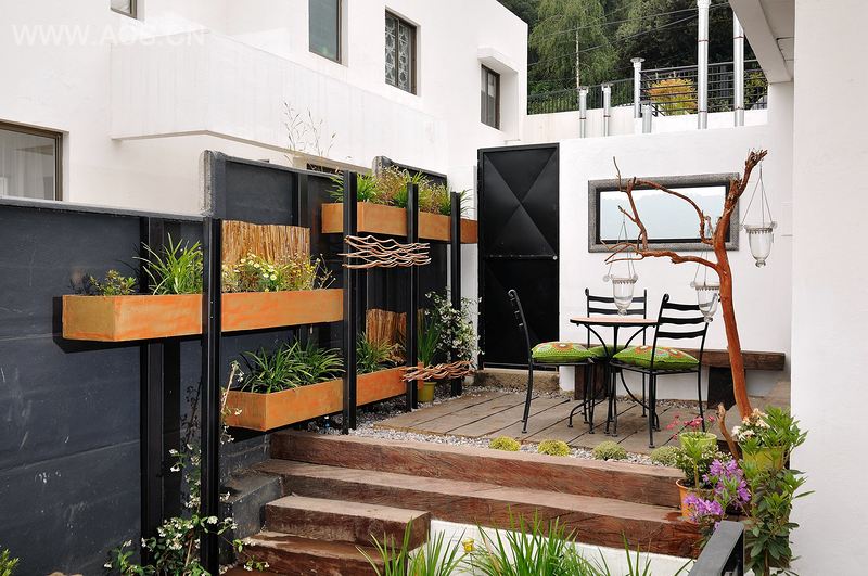 在枕木和卵石铺就的地板上设置用餐区,三面都是墙壁,一面朝向斜坡,起到缓和坡度的作用。每个阶地种植不同种类的草药和蔬菜。最后一层阶地是用混凝土做成的座椅,在这个休息区我们可以看到从花园边缘延伸开去的草坪和植物。垂直阶地的两边都种有植物,站在下层往上看,景色非常漂亮。