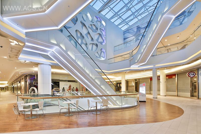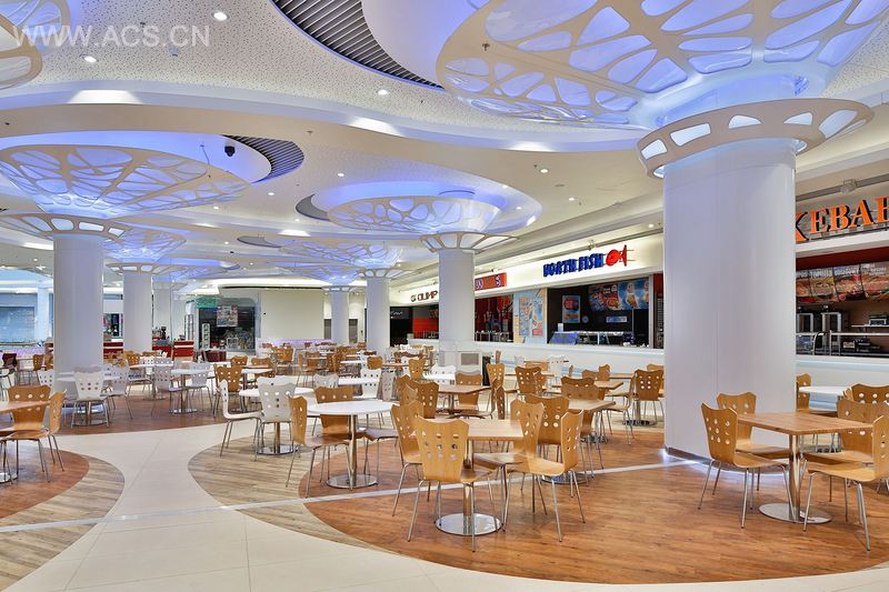 中央广场是本案的一个亮点,观光电梯和自动扶梯将其与楼层连接起来。庭院被用作表演的场地,或是用于组织有意思的活动。另一个有趣的亮点是美食广场。空间元素的安排以及照明的改变,强调了美食广场和购物区中间的空间。改变了传统的美食广场的陈词滥调。