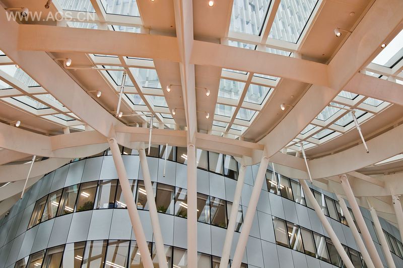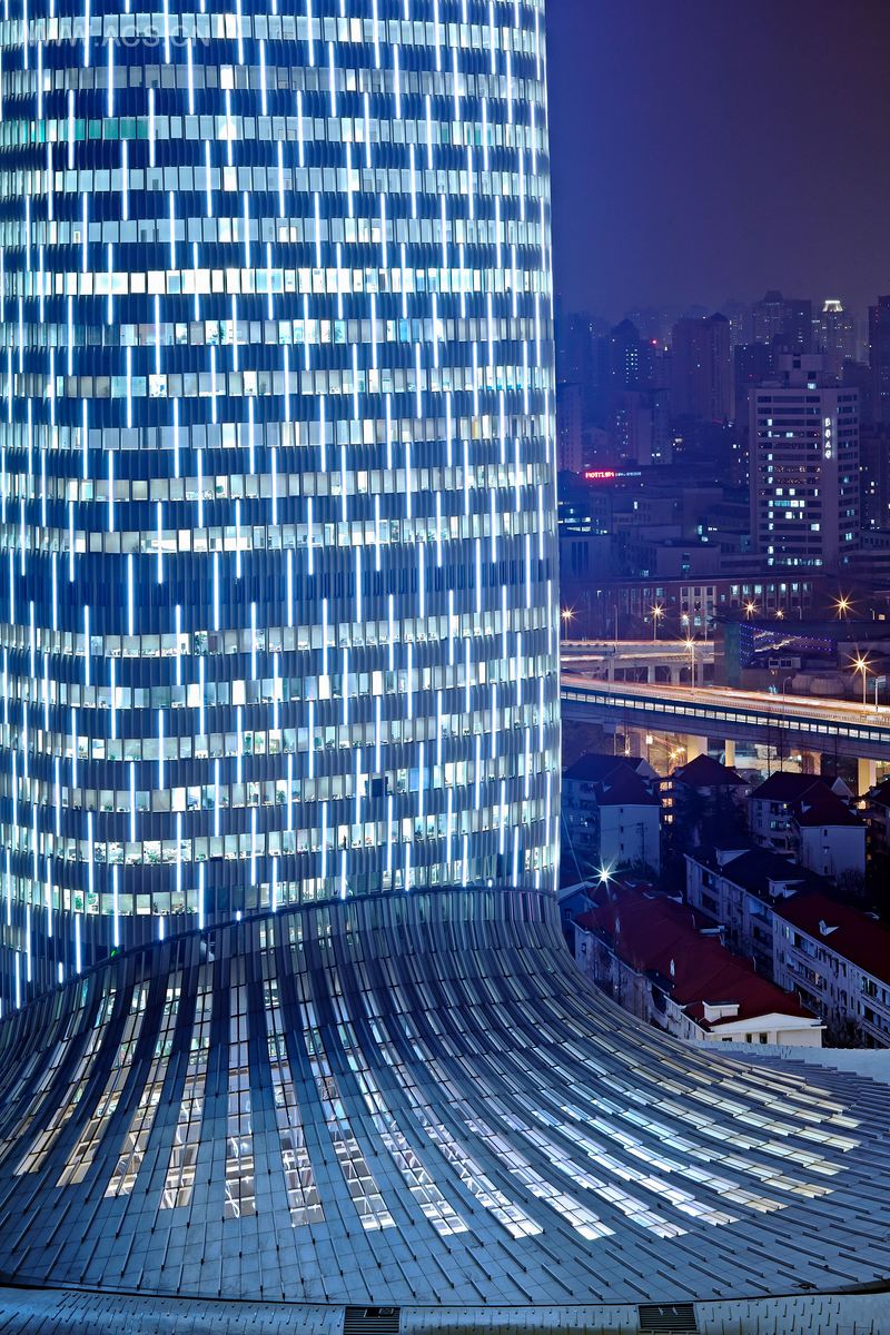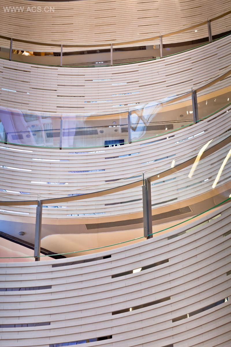 建筑造型柔美性感,仿佛一件设计剪裁臻于完美的晚礼服。外立面自上而下的装饰线条和LED灯仿佛礼服上闪烁的亮片,强化了建筑外形的流动感。在至塔楼与裙房的交接处,一个跨度超过60米的天窗将大量自然光引入中庭,与可调节的中央空调系统和台地式的购物连廊一起,为顾客提供了舒适的室外般的购物体验。