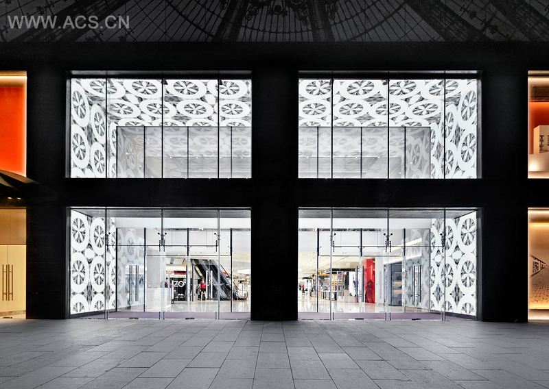 7 floors with a total floor plate of 35.000 m2. Two main atria with escalators allowed strong vertical circulation and views through the space. Each atrium was capped with a domed LED roof which contained the image of the coupole in Paris. The image can change with the seasonal fashion stories.