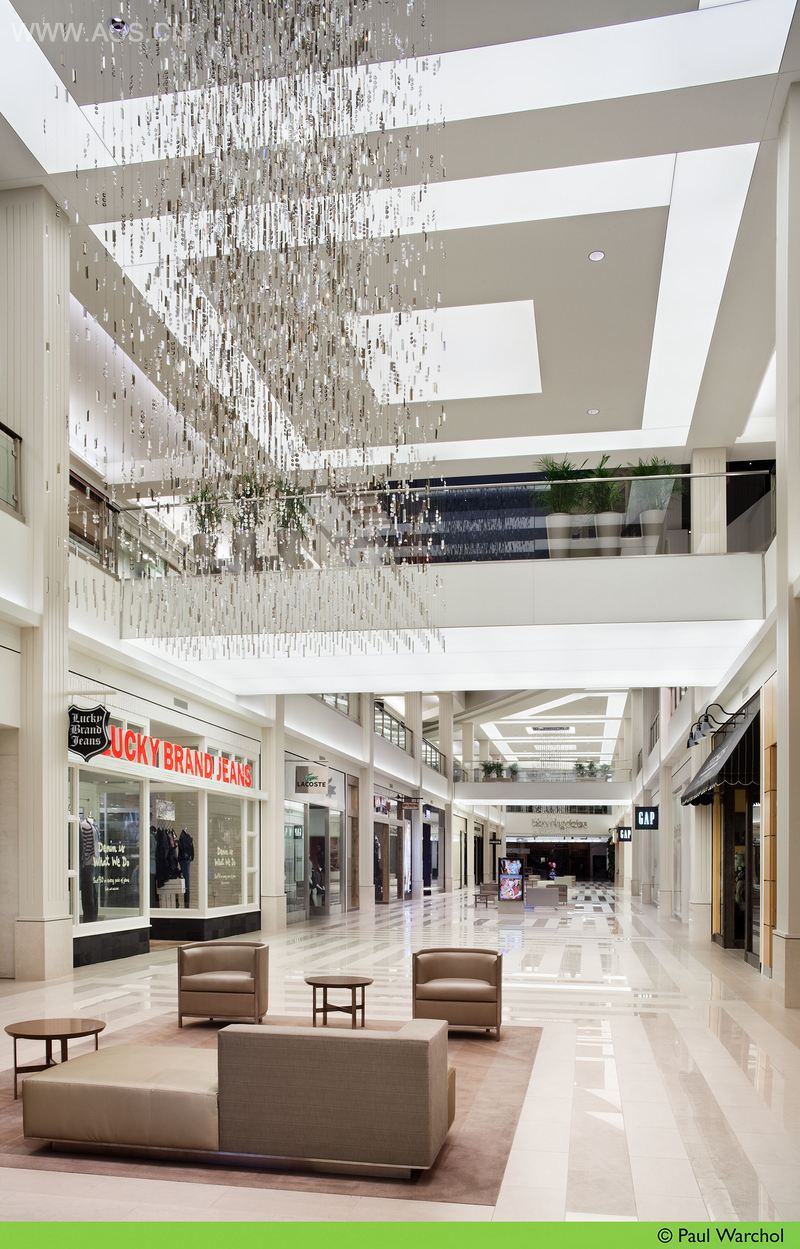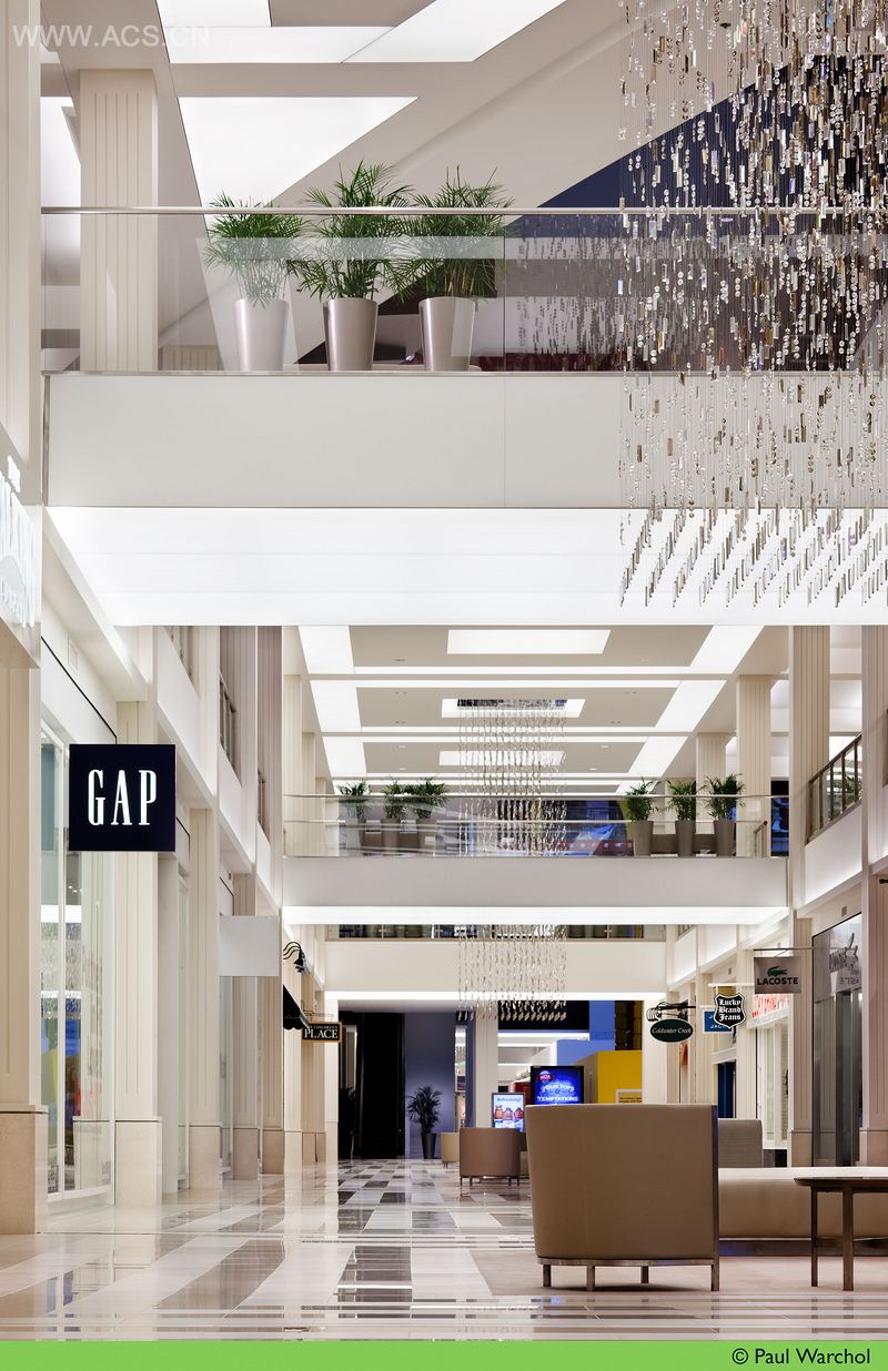 面积为4181平方米的东南庭院扩建被设计成美国购物中心内一处高雅所在,通过灯光和材料的应用打造愉悦的空间。同轴的框架概念在空间中反复应用,交替使用抛光和哑光的瓷砖地板,背景光描绘出阶梯式的天花凹陷处的形状。这些外延从八角形的东南庭院开敞的空间体量延伸到毗连的中庭扩建。灯光强调了垂直的空间:透明的彩色光柱从东南庭院翻新的天窗处照射而下,悬挂的装饰性金属天花装置增加了戏剧性的氛围。