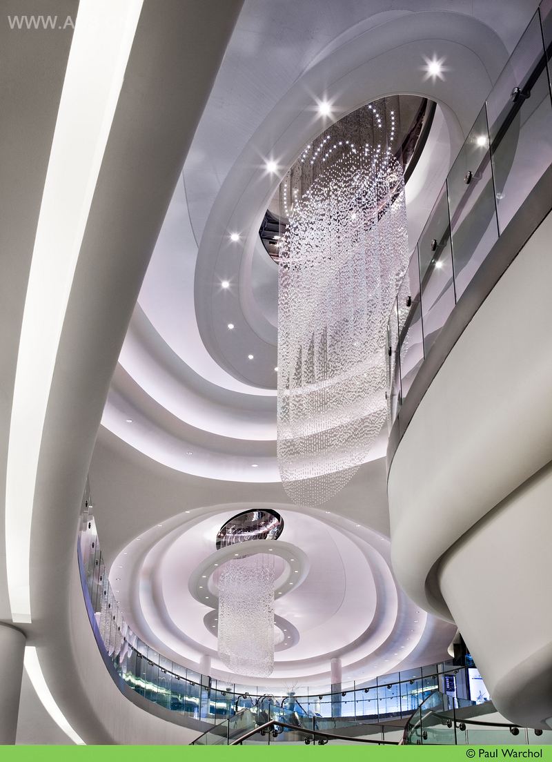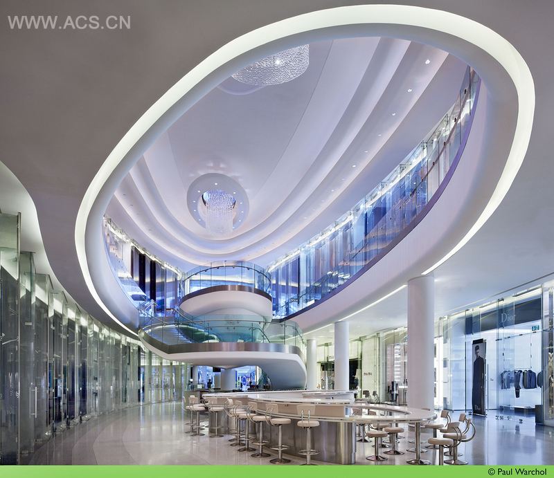 设计的中心理念是其现代性且适应于各品牌独特的定制特征。店面由全高的分层玻璃展示墙组成。波浪般的缎带将公共走廊与各个独立品牌店面划分开来。设计保留了整个三层的购物商场优雅的特征,灵活的店面能极好地展示各个品牌的独特形象,又不会弱化该购物公共空间的整体形象。