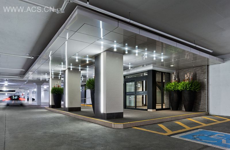 这是一项大范围的内部和外部改造工程,涉及新的入口外立面和门廊、中庭公共座位和设施、礼宾接待处、停车场入口和整体照明方案。过时的入口被引人注目的发光的入口所代替,其墙壁是LED照明的塑型玻璃纤维幕墙,像一幅超大的缎子帷幔随风飘舞。