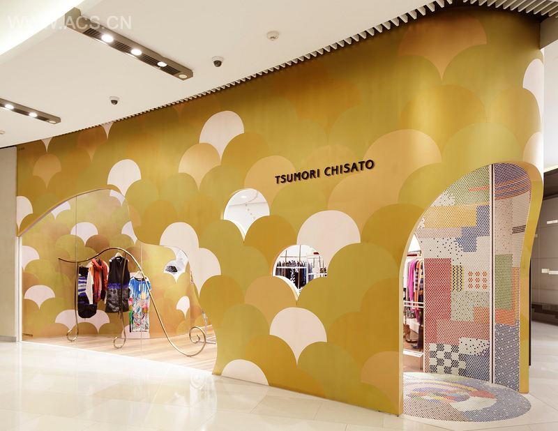 The shop facade features ‘Seigaiha’ or traditional Japanese wave patterns in several shades of gold. Elegant and distinctive curves outlining the openings are determined by overlaying Tsumori’s freehand sketch lines and illustrations onto the facade. Clothing racks are designed according to Tsumori’s illustration, and fun and charming design elements are scattered around the shop.