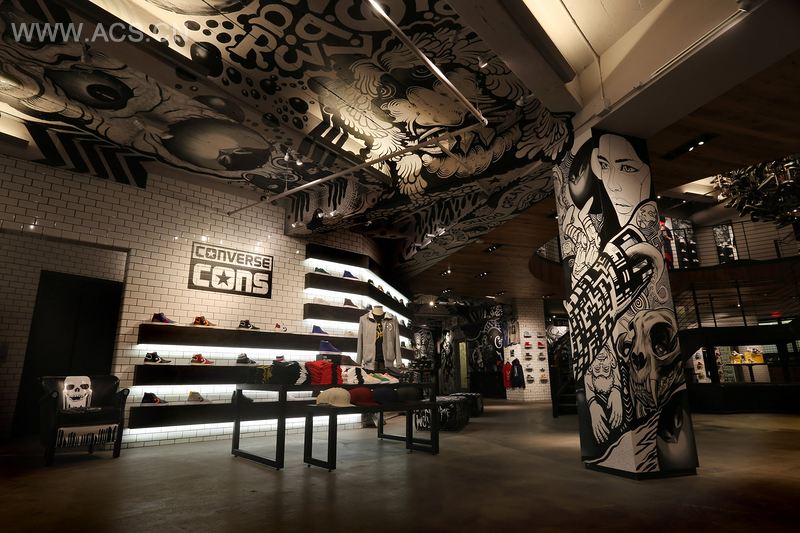A large customization zone on the ground floor allows customers to create their own unique products in collaboration with a Converse ‘maestro.’ Converse tapped local artists and the collaborative En Masse to create the distinctive black and white mural that defines this customization zone and the adjacent “Cons” section.