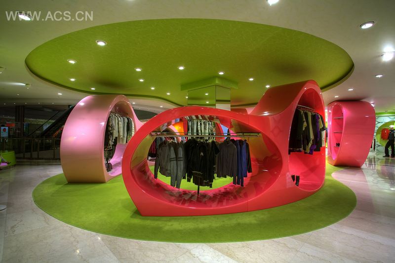 The space is filled with bright colored s – bl s – s of dynamics, depth, motion and emotion – hypermodern and the result of exploiting the tools provided by digital technology. The sensually shaped display elements are designed around the extensive grid of columns and have certain functions and presences that define particular diverse shopping experiences. The combination of form and orientation completely diminishes any references to the grid-like structure of the Cartesian world. Customers will feel like they’re strolling around in an urban organic forest, creating a multi-sensorial and memorable experience unlike any other shopping environment in the world.