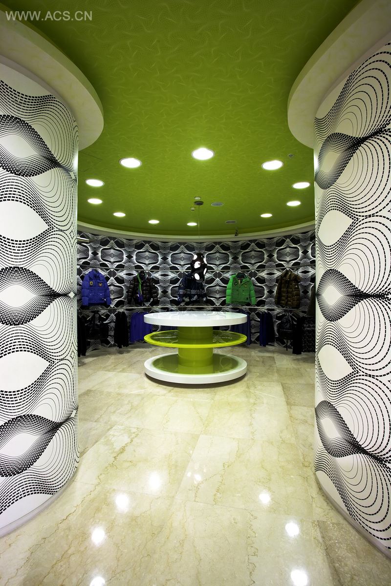 With this observation Karim Rashid created a technorganic seamless fluid ambience for pleasurable and experiential shopping and socializing. A Large digital pattern, reminiscent of a traditional Russian embroidery pattern of old techniques of cross stitching, defines the space itself, as walking through a large graphic art piece. Like the shape of the ever-undulating wall, the pattern is like sound waves, data, and information that embrace and envelop the shopper.