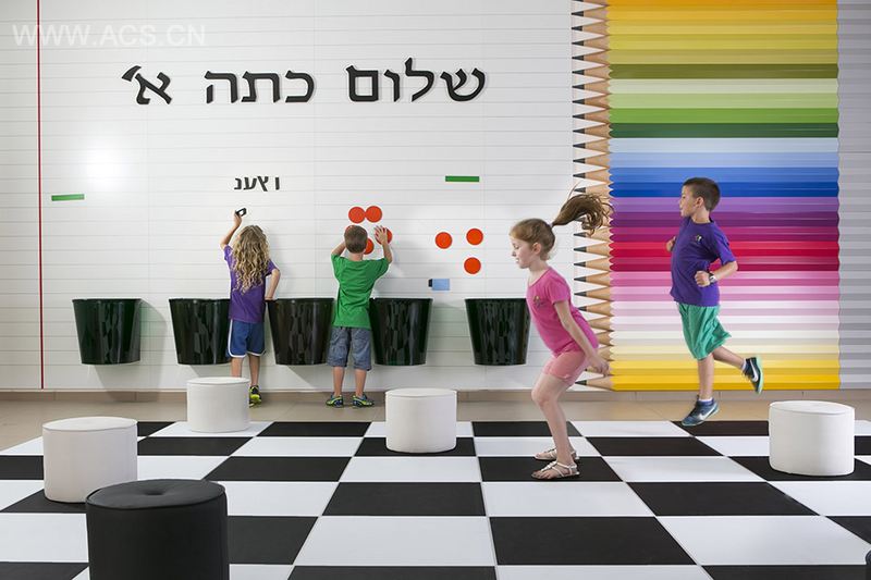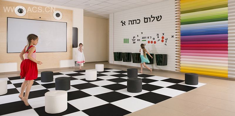 门厅中心有一片黑白棋盘状地面,这里能激发孩子们在此进行运动游戏。中央墙壁安装了彩色大铅笔作为装饰,带磁力的墙面可以让孩子们在上面玩字母,数字以及几何形状的拼贴组合游戏。角落一端墙上有一张机器人的脸,设计师将机器人张大的嘴改造成为屏幕,孩子们可以在这里自选音乐和电影并进行欣赏。