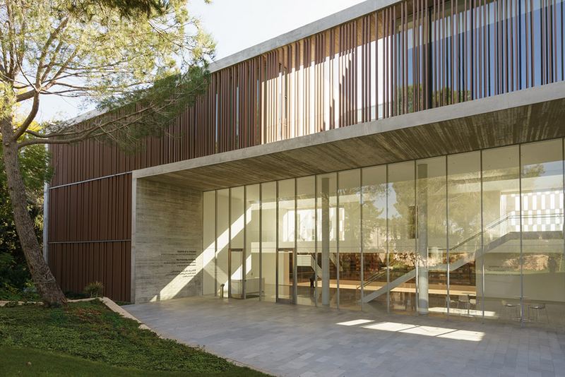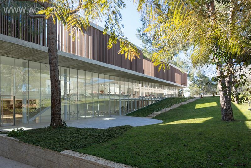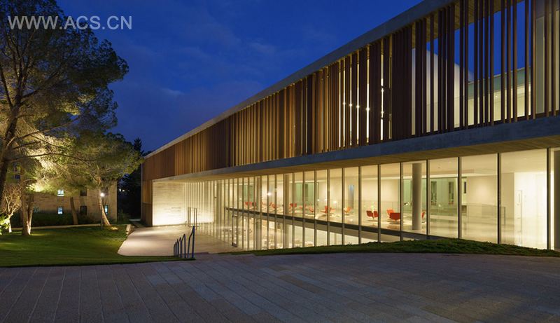 该高级研究学院属于耶路撒冷 Van Leer学院的人文社会科学院。建筑的南侧是悬崖,北侧是学校的中央花园,临靠校园主入口,坐落在坡地上。建筑顺应坡地而布局。功能包含研究室,会议室,展厅,报考厅,餐厅各双层车库。整个大楼的造型拥有强烈的水平延展感。面对悬崖的一侧采用石材幕墙(双层高阅览室处配有一条玻璃开窗),面对校园的一侧采用大面积的玻璃幕墙。