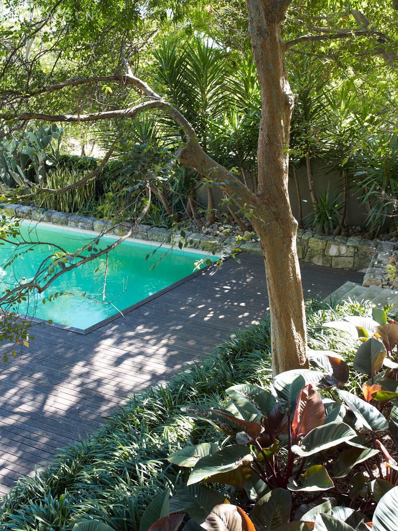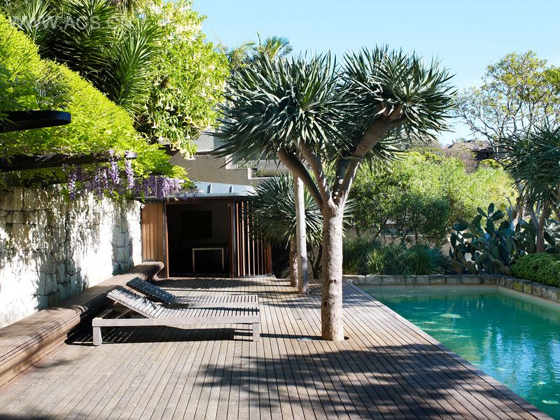 为本案设计一个简单的园林景观,设计师需要综合考虑其复杂的园艺背景。设计师将后面景观修剪成整齐的草坪,草坪中间点是用砂岩石做成的圆形阶梯空地,还有一处游泳池。游泳池由Luig Rosselli建筑师设计。本案使用砂岩石和观景木台等元素,整个设计非常具有开放性。
