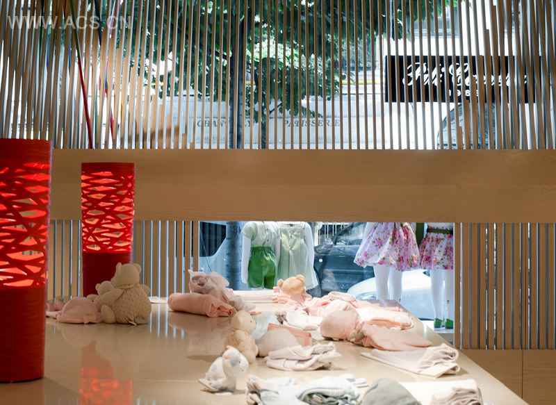 It is also relevant the relationship between the urban scale of the showcase and the scale of children's clothing. The flare generated by the sequence of interlocking slats of wood produces a transition between the large-scale of the showcase and small-scale of infant mannequins.
