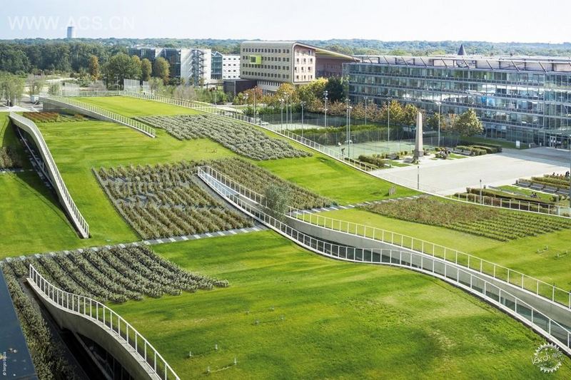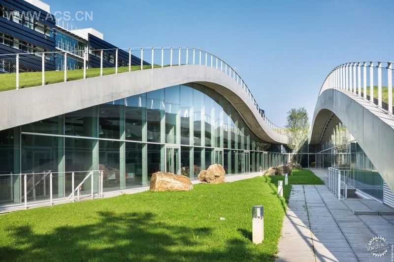 这个设计是由所谓的“景观波浪”定义的,拥有一个种植面积广阔的起伏状的混凝土屋顶。建筑采用了常在桥梁建设中使用的拱形结构技术,并恰当地设计了一个大的混凝土实验室。这个可达的绿色屋顶不仅为校园提供了室外的休闲空间,同时也强化了周围的结构,整合了方案的整体性。