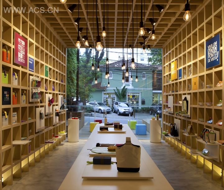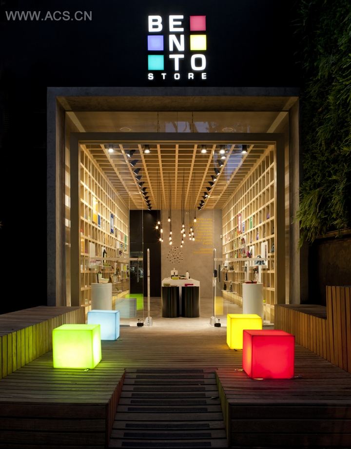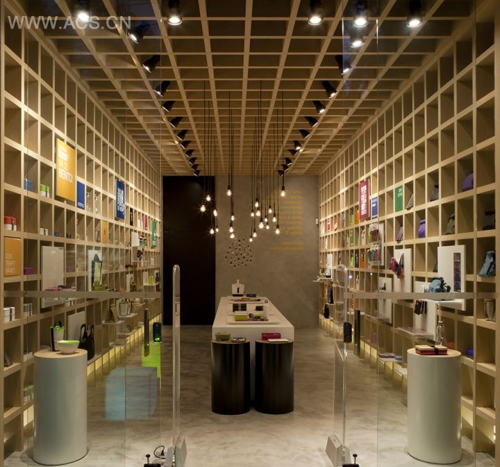 在团队的头脑风暴后,终于确定下展现产品的创意与特性的展示空间。木质基调,将产品交错摆放,门口的彩色正方体灯具为空间增色不少。