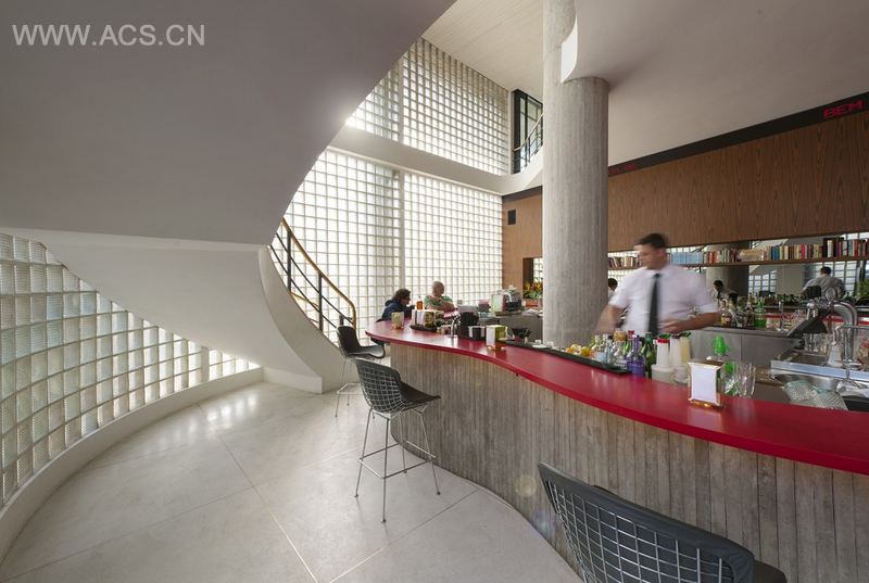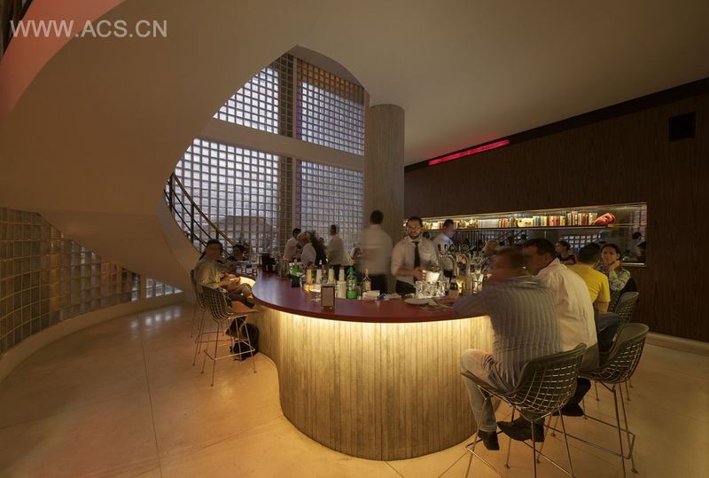 外立面的玻璃砖的曲线延续到内部,形成一个弯曲的吧台——由可丽耐树脂制成 ——环绕了整个一层。在该吧台中心,由服务生和酒保提供服务;而在其周围,客人可以看到整个空间,看到吧台里的所有人。不仅吧台,位于这一层的休息室也都采用了有机的形态。