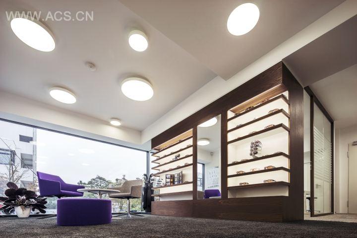 白色背景墙突出眼镜特性,天花板上大小不一的圆形灯具丰富空间光影层次,店面清新简洁,给人舒适感。