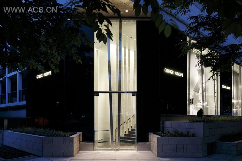 The new Giorgio Armani store in Roppongi Hills is an attempt to capture the sublime spirit of Japanese architecture and iconic landscape design in a setting that gives value to Giorgio Armani’s fashion while referencing the cultural context of the Tokyo store. The silver marmorino plaster on walls and ceilings are subtly reflected in the black granite floor. Against these simple surfaces are the stainless steel phorical "bamboo" elements, each imprinted with a white stipple that recalls the texture and form of a Japanese garden. These elements all recede into the background and act as a foil to the clothes and accessories, which occupy center stage. The long, narrow lower level has the feel of a catwalk, is designed to be used as a runway for special fashion events. Close attention to detail is a characteristic of the VIP rooms as well as the change and bathrooms. Cashiers desks are informal counters where clients sit in comfortable Armani Casa sofas, complementing the custom display racks and accessory cases, the design of which is also derived from Japanese craftsman furniture tradition. The facade is a continuous glass sheet with a rhythm of showcase windows as well as backlit, black panels punctuated by the Giorgio Armani Logo. All of this is elevated on a podium, a few steps above the wide sidewalk of fashionable Keyazaka Avenue. The concept was developed in close collaboration with Giorgio Armani, his lighting consultants and operations staff in Milan and Tokyo.