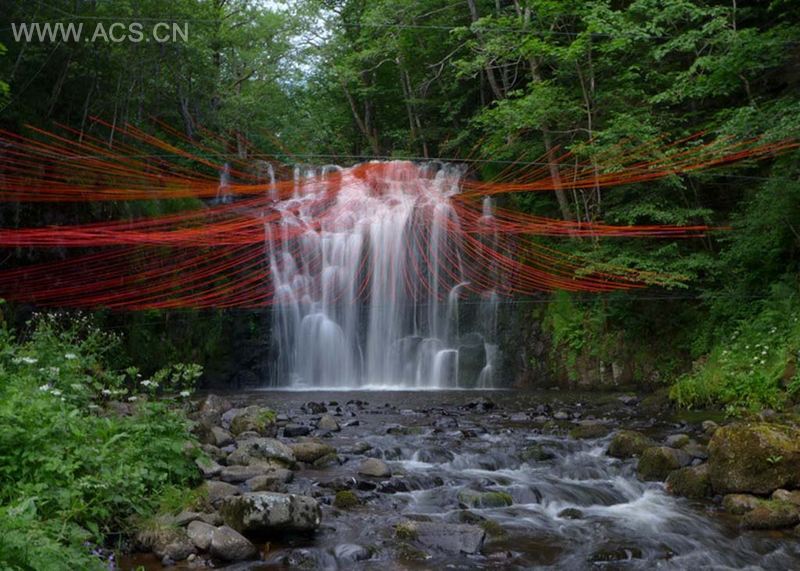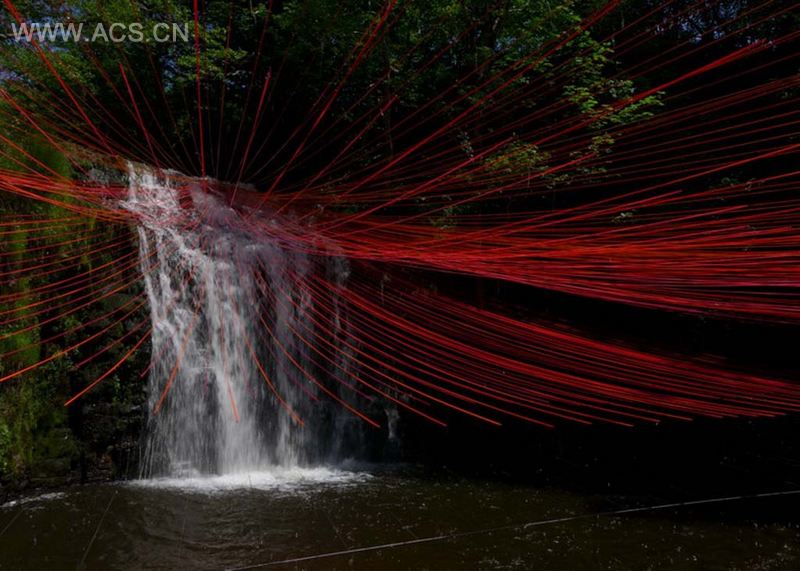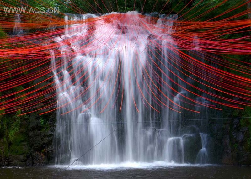 240串鲜红的丝线悬挂在法国中部桑西区Egliseneuve d'Entraigues的一处小瀑布前面,显得格外耀眼。Fabre解释道,“我这个滴水的动能艺术品旨在创建一个不同寻常的水上风景空间。”