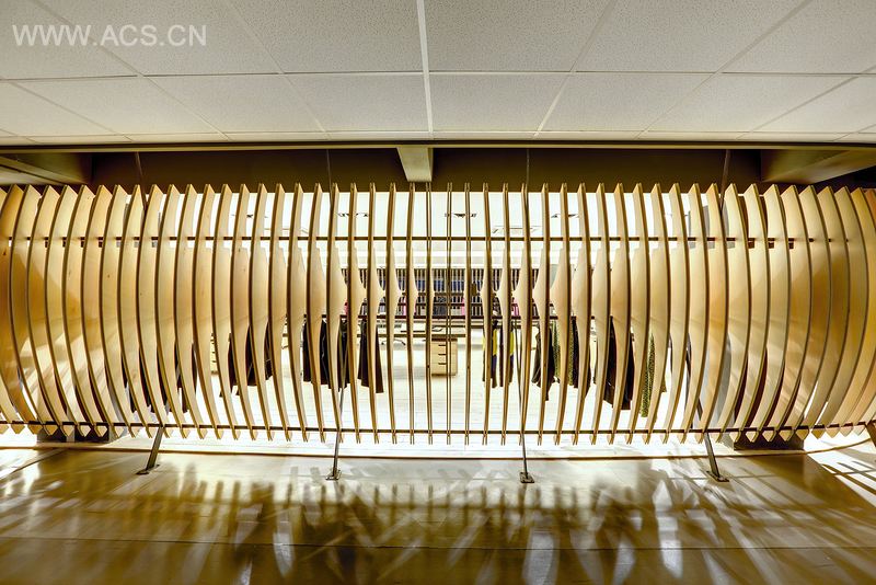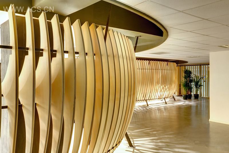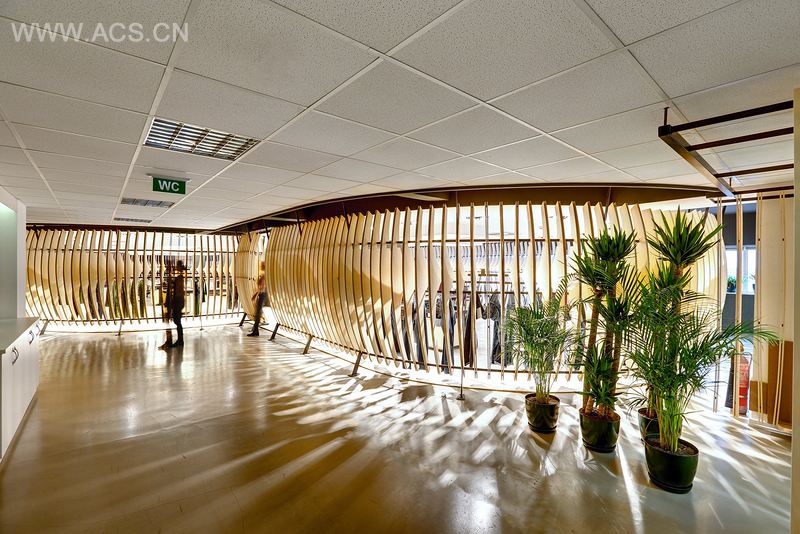 The shell contains 962 cnc-cutting slabs that create a curvilinear form, and seperating 500m² from the rest of the floor, which is 3000m² in total. Through the support of the steel structure, the shell is is freestanding and has no joints with ceiling or floor. The structure is designed as a clothes-hanger bar continuing around the office space besides its load-bearing function.