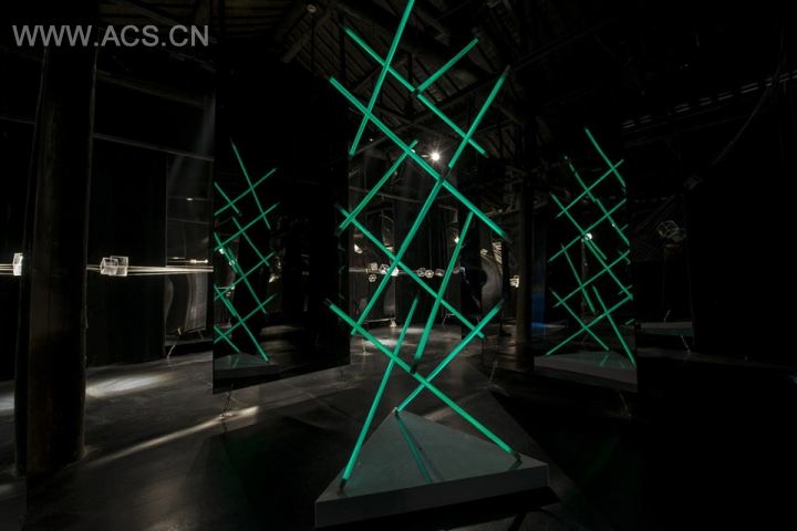 约50平米的空间被23枚双面镜面不锈钢板(double-side mirror stainless panel)分成了9个隔间,每个隔间约2.4×2.4米。正中间的隔间内放着一盏张拉整体结构的“最轻的灯”(the Lightest Light),这种结构由连续的拉索和不连续(不接触)的受压杆件组成,它的命名者建筑师B. Fuller认为整个宇宙都是基于同样的原理:内部受压的星球漂浮在引力的海洋中。