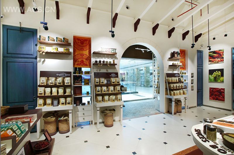 Two walls have been incorporated in the store which forms the spine within the space. These walls have been punctured with arches to get in the architectural flavour in this palette and are finished with white stucco texture and brick. Also few display units have been incorporated within the walls including the fabric curtains with motifs of spices patterns printed on it, that hang from the top most point of these punctures. Just beside these units are shelves that simulate the Indian kitchen with its spice containers of all kinds. To accentuate this feature we have used cut letters that speak out words like ”masala” in Hindi and whole grains.