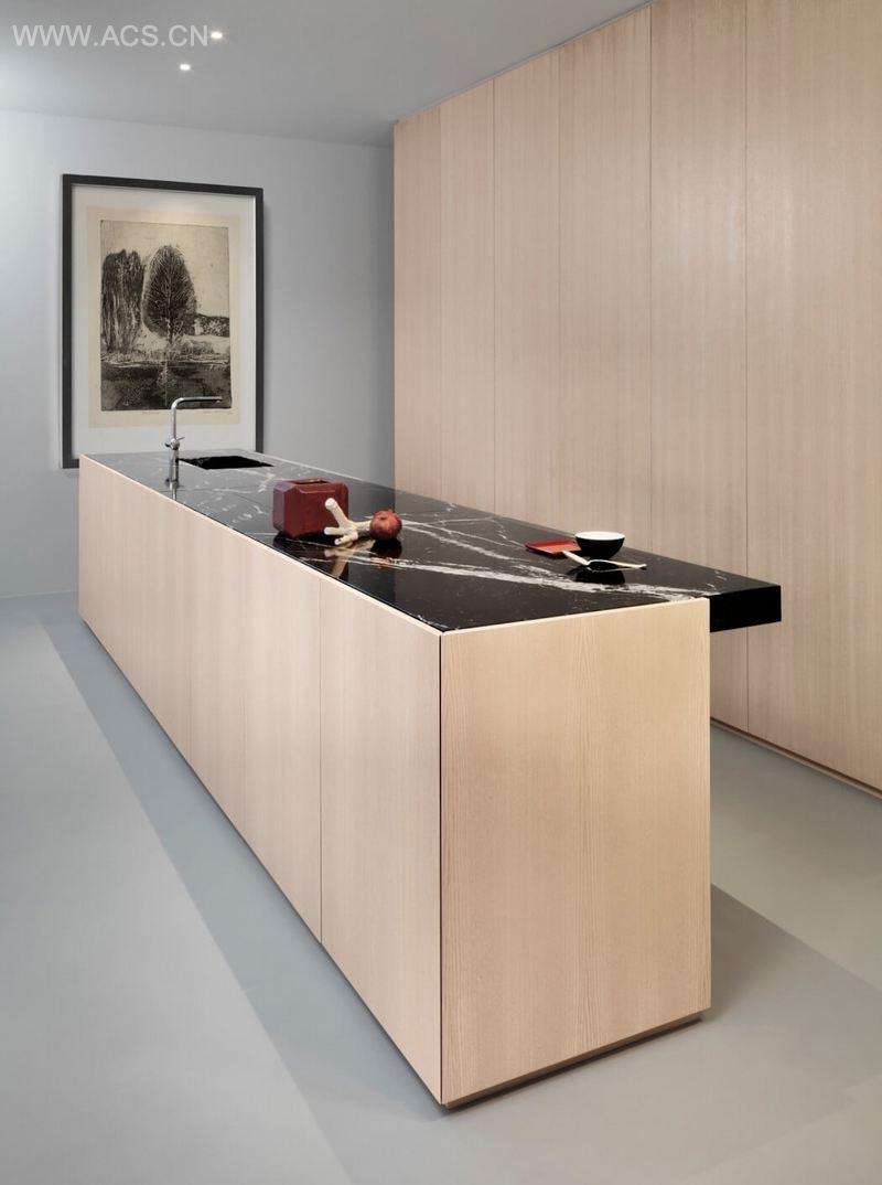 A pale grey concrete floor is combined with soaped ash and nero marquina marble in the kitchen island and the bathroom, as well as for the long bench in the living room. Between the kitchen and the entrance hall stands a “box” containing wardrobes, kitchen cupboards and a mirrored cloakroom.