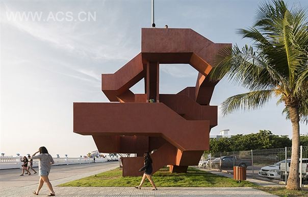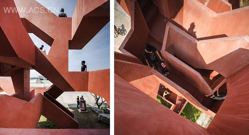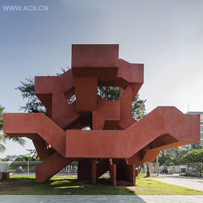 泰国最大的建筑材料水泥生产商SCG为了庆祝百年纪念日,全额资助三个泰国建筑事务所在泰国设计修建了三座社区公共设施,今天给大家介绍的这个红色立体迷宫是其中一座。迷宫的场地位于泰国沿海城市Bangsaen的一个海滨公园--是一座游乐场所。其余的两栋建筑是图书馆和凉亭。